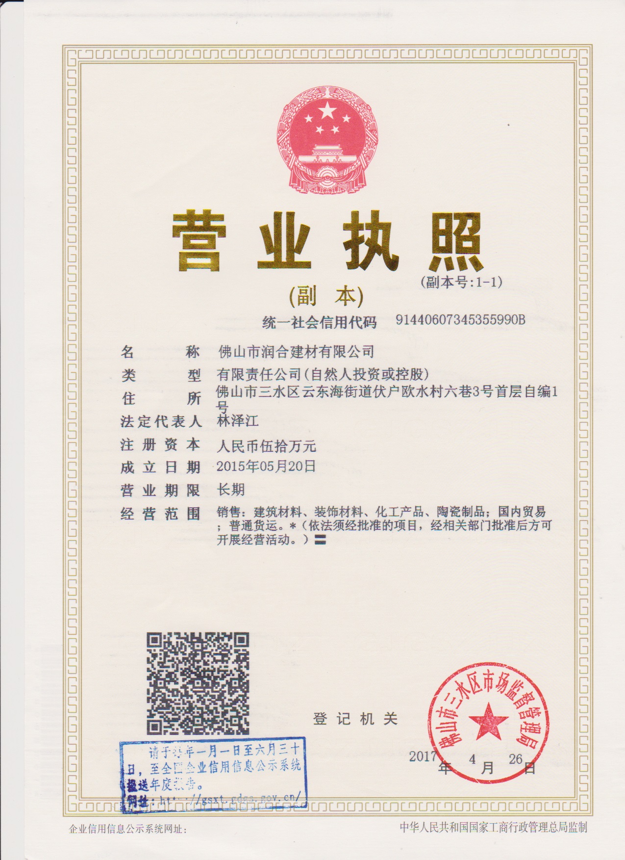 佛山市潤合建材有限公司成立于2015年5月,坐落于因北江、西江與綏江匯流而得名的廣東三水。創始人林澤江先生是一位典型的潮汕生意人,有著潮汕人不服輸不怕苦、